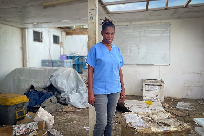 Sarah Maia, a midwife, stands amid the ruins of a cyclone-damaged clinic room at Lenakel Hospital. Over half of women in Vanuatu already experienced high levels of physical or sexual violence before the cyclone. “The cyclone has increased women’s vulnerability to sexual abuse,” shares Sarah, a survivor of gender-based violence (GBV).