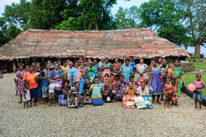 All the women of Nuvi village gather happily in front of their Nakamal after receiving their dignity kits during the UNFPA distribution. The dignity kits equip these women with essentials to maintain their health, hygiene, and dignity.